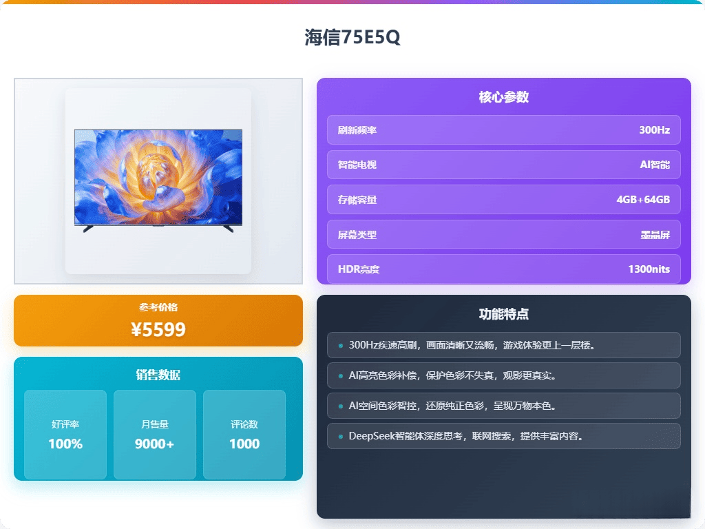 它还支持300Hz高刷新率,画面动静流畅,特别适合玩游戏或看运动比赛,视觉体验更顺滑。搭载的DeepSeek AI智能体,能智能识别内容,提供全景认知和家庭中枢功能,操作也更智能。